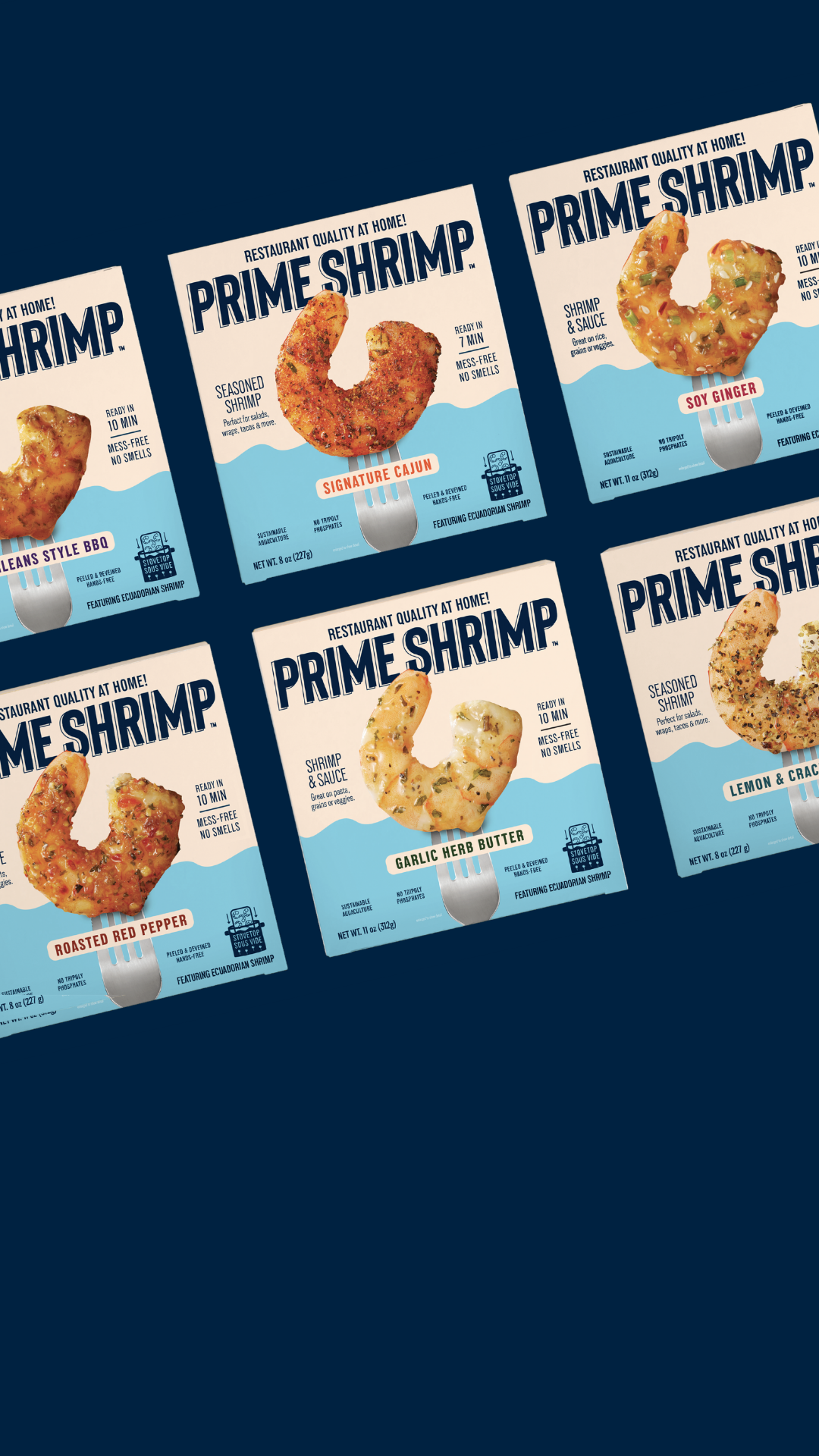 Premium shrimp plus gourmet sauce or seasonings cooks from frozen in under 10 minutes. No mess, no seafood smells and no complicated prep. If you can boil water, you can make restaurant quality shrimp at home any time with our totally ready-to-go Stovetop Sous Vide pouches.