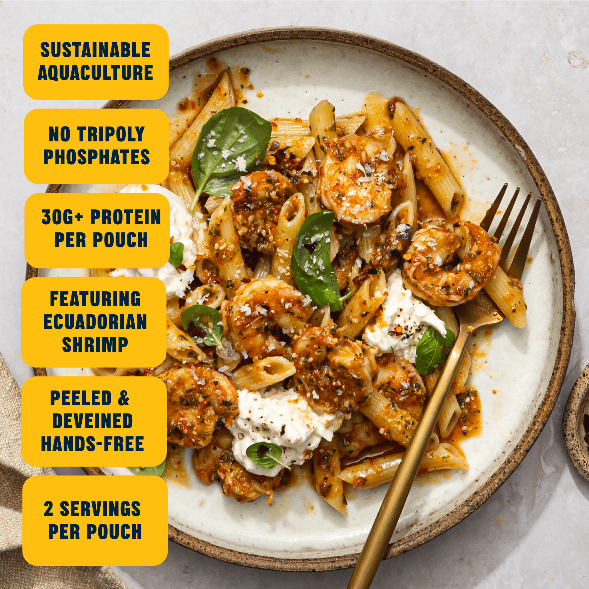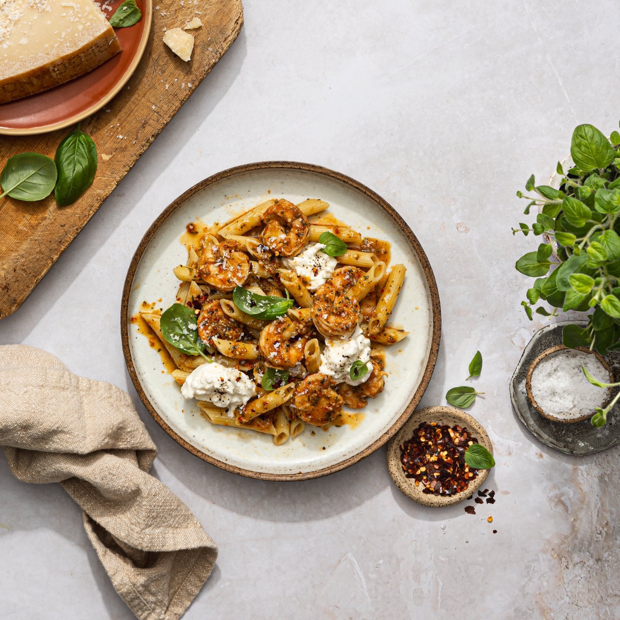 Peeled, deveined shrimp plus real olive oil, sweet bell pepper and parmesan cheese create a flavorful red pesto sauce that tastes fresh from a sun-drenched Mediterranean garden.